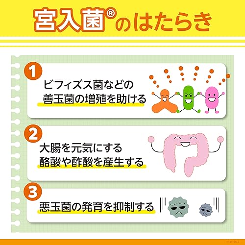 お召し上がり方:1回量を1日3回、食後に服用してください。15歳以上・・・1回3錠;11歳以上15歳未満・・・1回2錠;5歳以上11歳未満・・・1回1錠;5歳未満・・・服用しないでください。整腸生菌成分の1つであり、生物でもっとも耐久性があると言われている芽胞を形成する酪酸菌(宮入菌)を主成分とした整腸薬です。この酪酸菌(宮入菌)が腸内有益菌の働きを高め、有害菌の働きを抑えることにより、整腸作用を示します。医薬部外品。※ミヤリサン錠には1錠あたり10mg、強ミヤリサン錠には1錠あたり30mgの宮入菌末が配合されています。