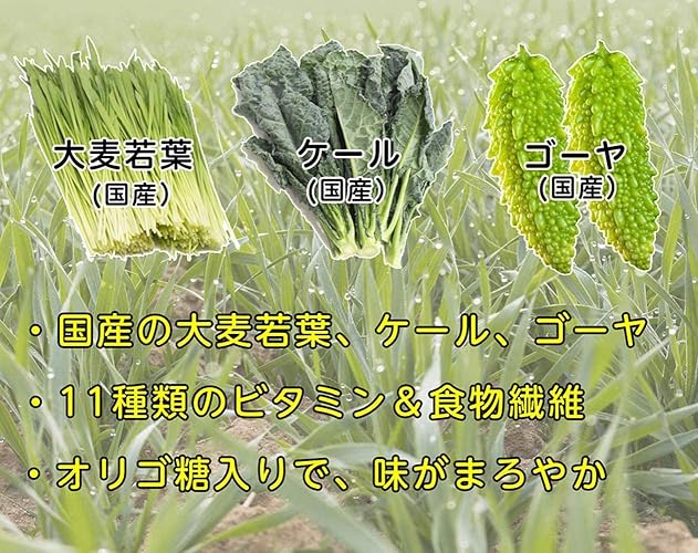 【原材料】難消化性デキストリン(アメリカ製造)、大麦若葉粉末、デキストリン、還元麦芽糖水飴、クロレラ粉末、ケール粉末、ゴーヤ粉末、フラクトオリゴ糖/ビタミンC、甘味料(スクラロース)