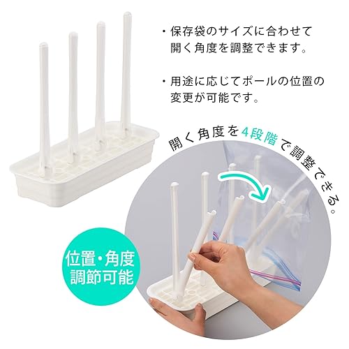 ポールはV字に開くので、食品保存袋などの水切りにも便利。保存袋のサイズに合わせて開く角度を4段階に調整できる。