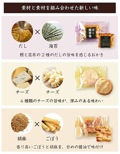 パッケージにはアイボリー調の色を使用し、シンプルな中にも上質さと、温もりが感じられる色合いです。商品を開けると、カラフルな色とりどりの個包装が入っており、好きな味を選ぶ楽しさを演出します。【商品内容】24個入(だし海苔巻4個、桜えびレモン4個、4種のチーズ4個、トマトペッパー4個、アーモンドメープル4個、胡麻ごぼう4個) 【商品サイズ】直径14.0cm×高さ12.0cm