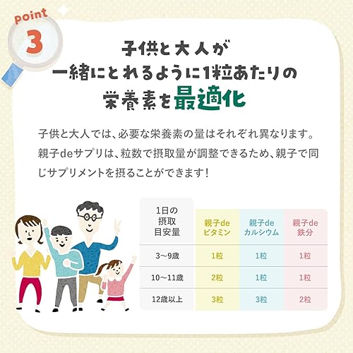 【1日の目安】 1~3粒/日 ※お子様は1粒がおすすめです。 【主要成分/1粒当たり】 カルシウム:133mg、ビタミンD:1.0μg、植物性乳酸菌:33億個、ポリグルタミン酸:2mg / 毎日お摂りいただけるよう安心安全にこだわっています。 【アレルゲン(28品目中)】 乳 【ご注意】 ※商品により多少の色の違いがありますが、品質に問題ありません。 ※まれに割れや欠けが発生することがあります。持ち運びの際はお気をつけください。【ココア風味でカルシウムをおいしく補給!】 親子で一緒に、おいしくカルシウムや乳酸菌を補給! 食事での不足分を補うことだけでなく、安心して摂取できることまで考え、栄養素や量を設定。さらに、カルシウムと一緒に働くビタミンDやポリグルタミン酸も配合しました。 お子様も大人も、水なしで噛んで食べられるココア風味のチュアブルタイプです。 【親子で食べたくなるおいしさ!】 発売前のモニター調査では、親子deカルシウムの味について、お子様は92%、大人は93%が、7段階評価で「とてもおいしい」「おいしい」「ややおいしい」と回答しました。 ※2020年9月 FANCL調べ 【1日の目安】 1~3粒/日 ※お子様は1粒がおすすめです。 【主要成分/1粒当たり】 カルシウム:133mg、ビタミンD:1.0μg、植物性乳酸菌:33億個、ポリグルタミン酸:2mg / 毎日お摂りいただけるよう安心安全にこだわっています。 【アレルゲン(28品目中)】 乳 【ご注意】 ※商品により多少の色の違いがありますが、品質に問題ありません。 ※まれに割れや欠けが発生することがあります。持ち運びの際はお気をつけください。