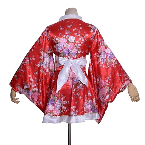 [HONGFU] 婦人向け 短い着物コスチューム 花柄長袖 日本の伝統的な 芸者 浴衣 ロリータドレス セクシーなバ スローブ 寝間着ローブベルト衣装 (S02# 短 赤)