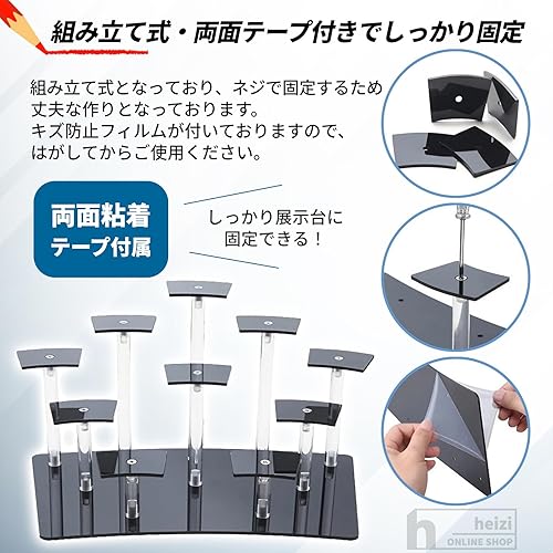 【組み立て式・両面テープ付きでしっかり固定できる】組み立て式となっており、ネジで固定するため丈夫な作りとなっております。キズ防止フィルムが付いておりますので、はがしてからご使用ください。両面粘着テープも付属しておりますので、しっかり展示台に固定する事ができます。