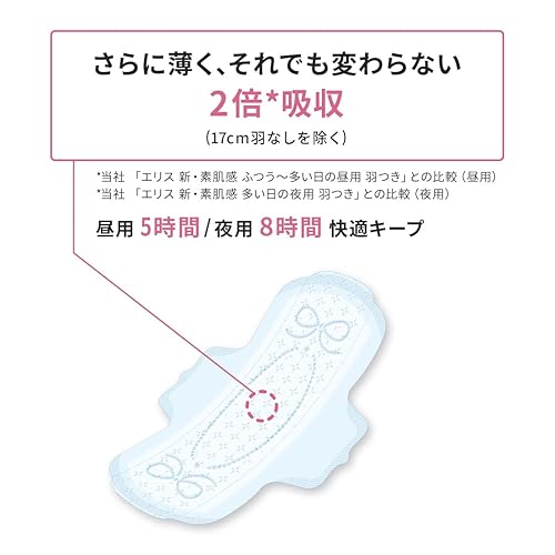 5時間べたつきにくい:経血をたっぷり吸収しても、5時間べたつきにくい※1。たっぷり2倍※1吸収:スリムなのに超吸収ポリマーがぎっしり詰まっているので、普通のナプキンの2倍※1吸収。わずか1.9mmの極薄シート:個包装もスリムで持ち運び時もコンパクト。動いてもしっかり固定:ショーツ接着部分の面積※2UPで動いてもモレ安心。足まわりの違和感低減:両サイドのフチ部分のなめらかさ4%UP※2。