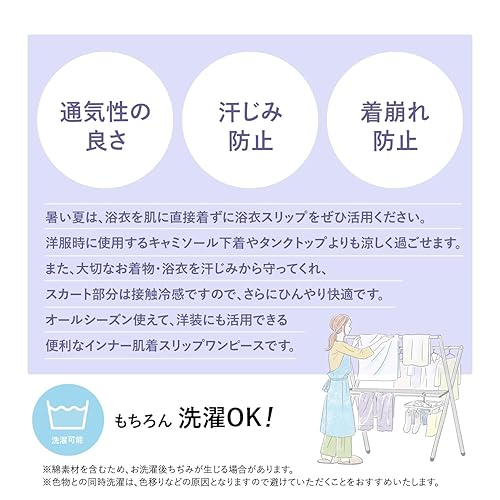 \スカート部分が涼しい接触冷感素材♪/ 夏の浴衣姿を快適に!汗ばむ季節にぴったりの涼やか和装肌着(袖なしワンピースタイプ) 浴衣をお召しの時の下着(インナー)として最適で、暑い季節に、汗をしっかり吸収し、汗じみや汚れからあなたの着物を守ります。 もちろん着物の着崩れ防止、浴衣の透けも防止します。 和装用の設計でお作りしているので、普段着ているキャミソールやタンクトップとは着物の下に着たときの着心地が格段に違います。 汗ばむ上半身には、吸水性に富んだサラシ綿100%がお肌をいたわりながらしっかり吸汗。 下半身は、接触冷感素材を使用。サラサラした肌触りの絽目メッシュポリエステル生地。 通気性の良い生地で、足にまとわりつくことなく、裾さばきが大変良いです。 これはもう間違いなく夏の浴衣着用時の必需品。 出来る限り多くの方に提供したいという思いからお手頃価格で提供しております。 ぜひお手に取り、夏のイベントやお出かけにお試しください。