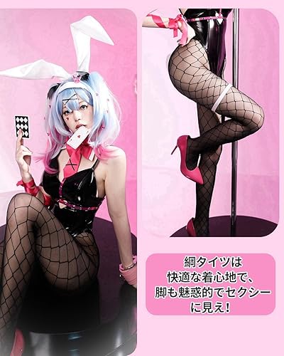 ※【セット内容】:「レオタード」+「うさ耳」+「付け襟」+「腕飾り」+「ヘッドバンド」+「リボン」+「アームリング」+「蝶タイ」+「レッグリング」+「頭飾り」+「バッジ」+「ピン」+「カード」+「透明ブラストラップ」+「タイツ」+「尻尾」。エナメル革な生地を使用し,質感や細部も丁寧につくられておりますので,本格的な着こなしが可能です。
