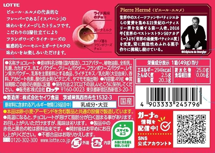 原材料:砂糖(国内製造)、ココアバター、植物油脂、全粉乳、乳糖、カカオマス、ホエイパウダー、クリームパウダー、フランボワーズパウダー、レモン果汁パウダー、乳等を主要原料とする食品、ライチエキス/乳化剤(大豆由来)、香料、アカビート色素、酸化防止剤(ビタミンE、ヤマモモ抽出物)