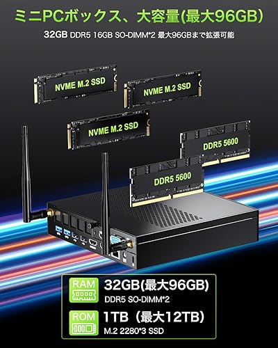 【高速DDR5メモリ&大容量ストレージ 最大96GB RAM拡張可能】GMKtec K10 ミニPCは、最先端のDDR5 32GB RAM(デュアルチャネル2 x 16 GB)を搭載し、最大96GB RAMまで拡張可能です。1TB M.2280 PCIe 4.0 SSD を搭載し、デュアルスロットにより 最大12TB のストレージ拡張が可能です。(アップグレードは除く)