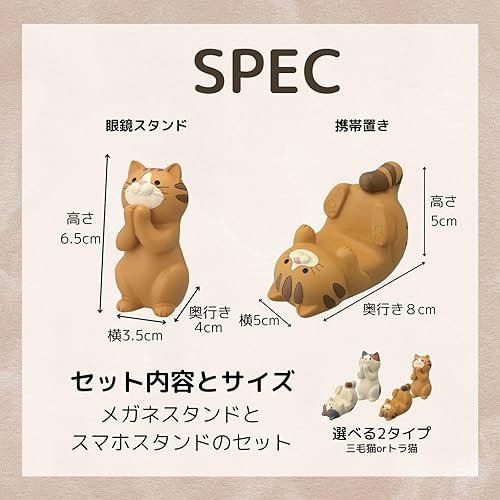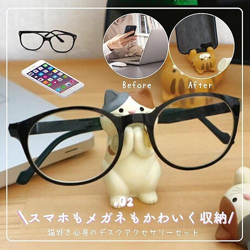 セット内容とサイズ:携帯置き(高さ5cm 横5cm 奥行き8cm)・眼鏡スタンド(高さ6.5cm 横3.5cm 奥行き4cm)猫のスマホスタンドとメガネスタンドで毎日のデスク周りを楽しく:猫のユーモラスなデザインが、毎日の作業や仕事の合間にほっとした笑顔を届けます。オフィスや自宅のデスクに癒しを与えるこのスマホ立てとメガネ置きのセットは、見ているだけで心が和むインテリアアイテムです。