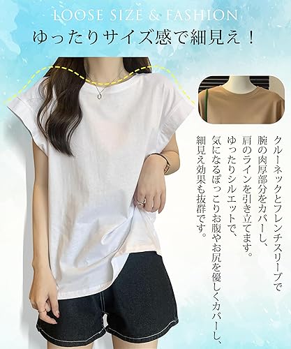 【ゆったりTシャツ・細身見え】当店のフレンチスリーブTシャツはゆったりとしたシルエットが特徴で、気になるぽっこりお腹やお尻を優しくカバーしてくれます。リラックスした着心地でありながら、すっきりとした印象を与えます。裾をタックインしても、かさばらずスタイリッシュに決まります。着瘦せ効果抜群のレディースTシャッツです。
