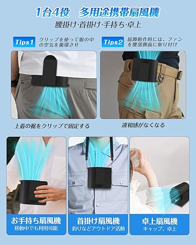 ✅【6 in 1&多機能携帯扇風機】 腰掛け・首掛け・卓上・手持ちの4way + LED照明・バッテリー機能付きファンです。1.クリップをベルトに掛けると、服の中に風を送り、作業中の蒸し暑さを解消します。2.付属ネックストラップをつけると、両手が自由に使える首掛け扇風機に変身します。3.軽量設計なので移動中でも手持ちファンとして手軽に使えます。4. 卓上に置けば、自宅やキャップ時に便利な卓上ファンとして活用できます。5.【LED照明機能付き】6.【バッテリー機能付き】1台で6通りの使い方が可能で作業·サイクリング·釣りなど様々なシーンで使い勝手抜群です!