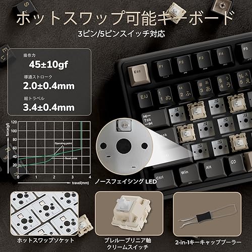 ホットスワップ可能なメカニカルキーボード軸: プレルーブ クリーム軸を3ピン/5ピン対応で交換可能。滑らかな打鍵感と深みのあるサウンドで、ゲーミングキーボードとしてのタイピング快適性を最大化します