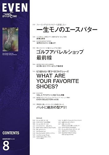 一生モノのエースパターを手に入れる! ということで、EVEN8月号はパター選びのポイントから最新のトレンドやモデルの紹介、一緒に使いたいヘッドカバー、人気コーチのパッティングレッスンまで、パターを極める情報満載をお届け。読めばパット巧者になれること間違いなしの特集です。