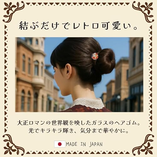 大正ロマン柄のガラスヘアゴム洗練された大正モダンの美意識を今に映す、【大正ロマンガラス】のヘアゴム。 どんなヘアスタイルにもなじむ落ち着いたデザインでありながら、アンティークな雰囲気と独自の個性が光るアクセントに。 毎日のスタイリングに“アート”を加え、日常をほんの少し贅沢に彩ってくれます。 ● 大正ロマンの世界観を纏う レトロとモダンが融合した独自のデザイン。和装はもちろん、カジュアルな洋服にも自然にマッチします。 ● ガラスならではの透明感と存在感 きらりと光を反射するガラス素材は、髪元に軽やかな輝きをプラス。季節を問わず使える上品さが魅力です。 ● 日本製・丁寧な仕上げ 安心の日本製。しっかりとしたゴムで髪をやさしくまとめてくれます。 ● ギフトにもおすすめ 大正ロマン好きな方、和モダンな小物を探している方への贈り物にも最適。高級感ある仕上がりで喜ばれます。 懐かしさと新しさが同居する、大正ロマンの世界をあなたの髪に。 【大正ロマンガラス】のヘアゴムで、日常を少しだけ非日常に。