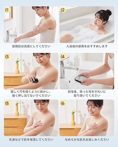✨【脱毛と角質ケアを同時に行う「Wスムース設計」】 製品表面の微細なナノ粒子構造は、ムダ毛を根元から取り除くだけでなく、古い角質をやさしくポリッシュする効果も備えています。市販の粗い研磨材とは異なり、肌への負担を最小限に抑えた滑らかな質感が特長です。太もも、ふくらはぎ、二の腕、お腹など、全身の気になる部位でお試しいただけます。わずか10秒ほどの軽いケアを続けることで、毛の目立たない、透明感のあるなめらかな素肌へと導きます。