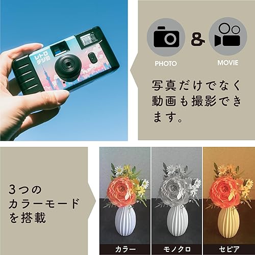 カラー、モノクロ、セピアの3モードを搭載し、ノスタルジックな「平成レトロ」感あふれる写真が撮れます。もちろん音声付きの動画撮影も可能です。