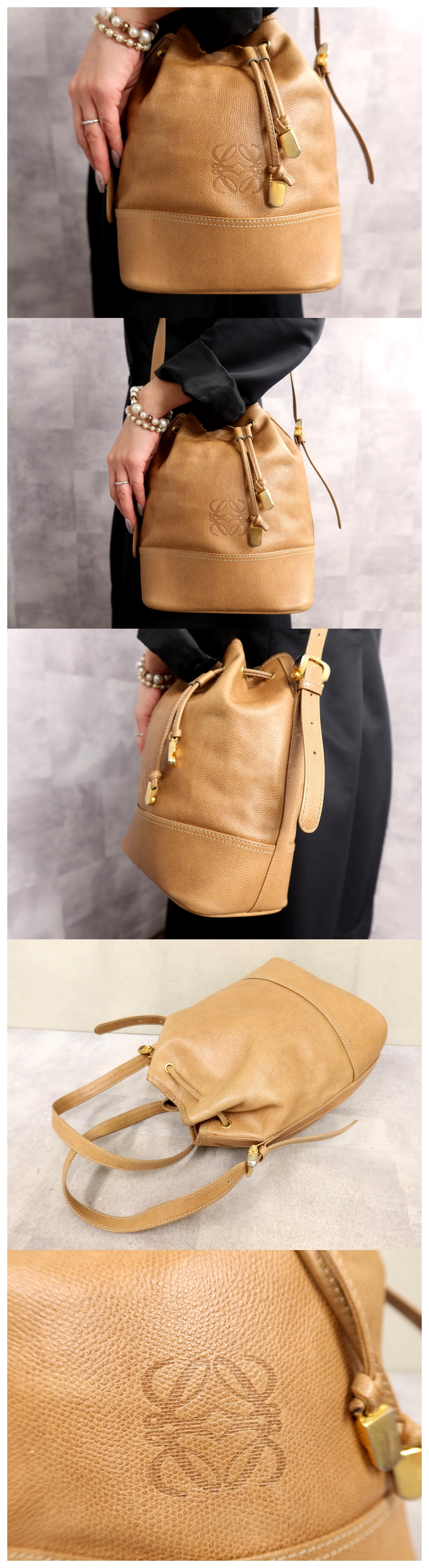 Original Japanese name: ●美品●LOEWE ロエベ●アナグラム●ロゴ型押し●カーフ レザー 本革●巾着 ショルダー バッグ●ブラウン系●ゴールド金具●Js64465