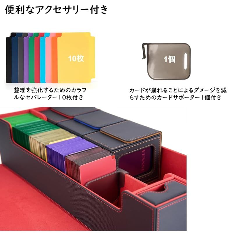 【カラフルな仕切りで簡単な整理】このカードボックスには、10枚のカラフルなセパレーターが付属しており、カードやアクセサリーを簡単に整理・分類できます。このセットアップにより、カードを素早く識別して取り出せるので、時間を節約し、効率が向上します。