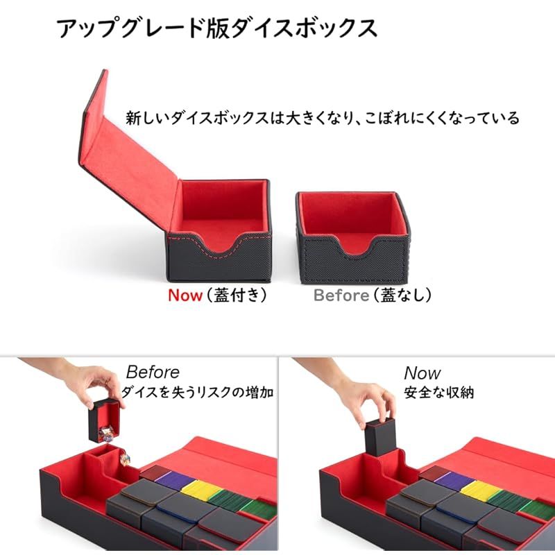 【複数デッキの持ち運びに便利】この 大容量 カードストレージは、5つの小型カードボックス(ディスプレイウィンドウ付き、別売り)をまとめて収納可能、5つのデッキの収納に最適です。アップグレードされたダイスケースには蓋があり、ダイス、サイコロ、ダメージカウンター、毒/マーカー、トークンを収納可能です。また、プレイマット用収納コンパートメントがあり、プレイマットや一重スリーブカード650枚、または二重スリーブカード520枚を収納できます。すべての必需品を1つのトレカ カードボックスにまとめられます。